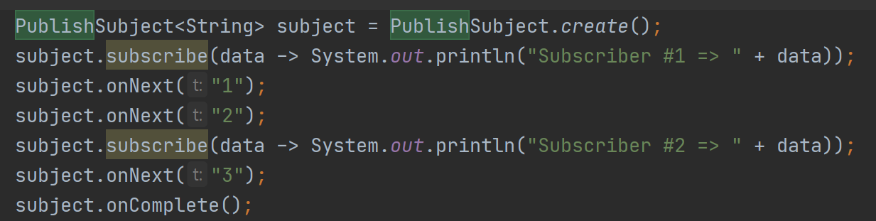 Subject는 Observer를 구현하므로 onNext(), onError(), onComplete()등의 메서드를 수동으로 호출하여