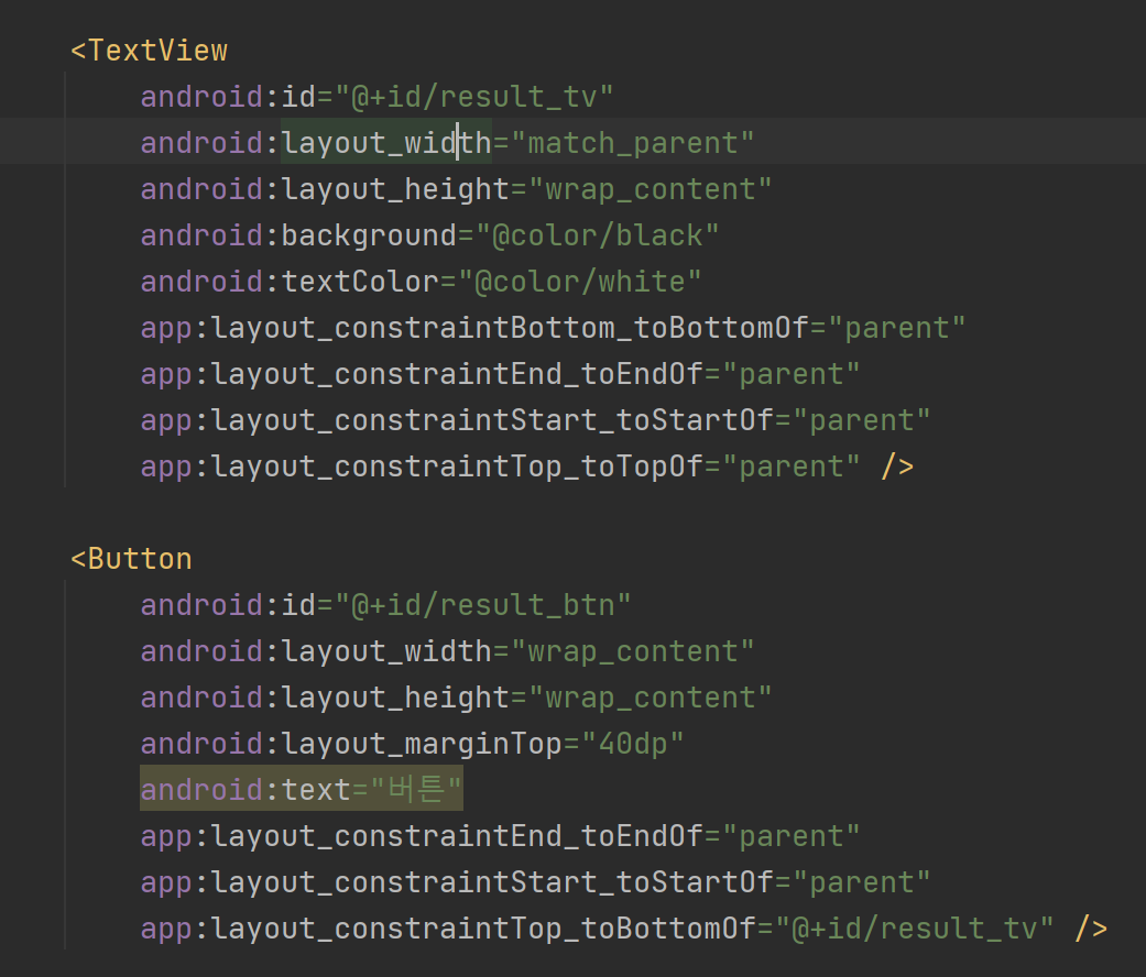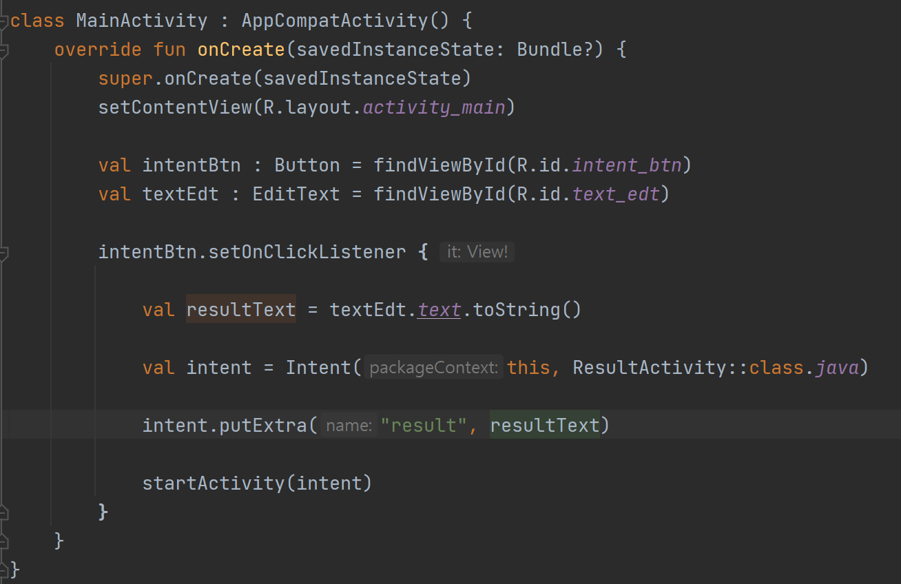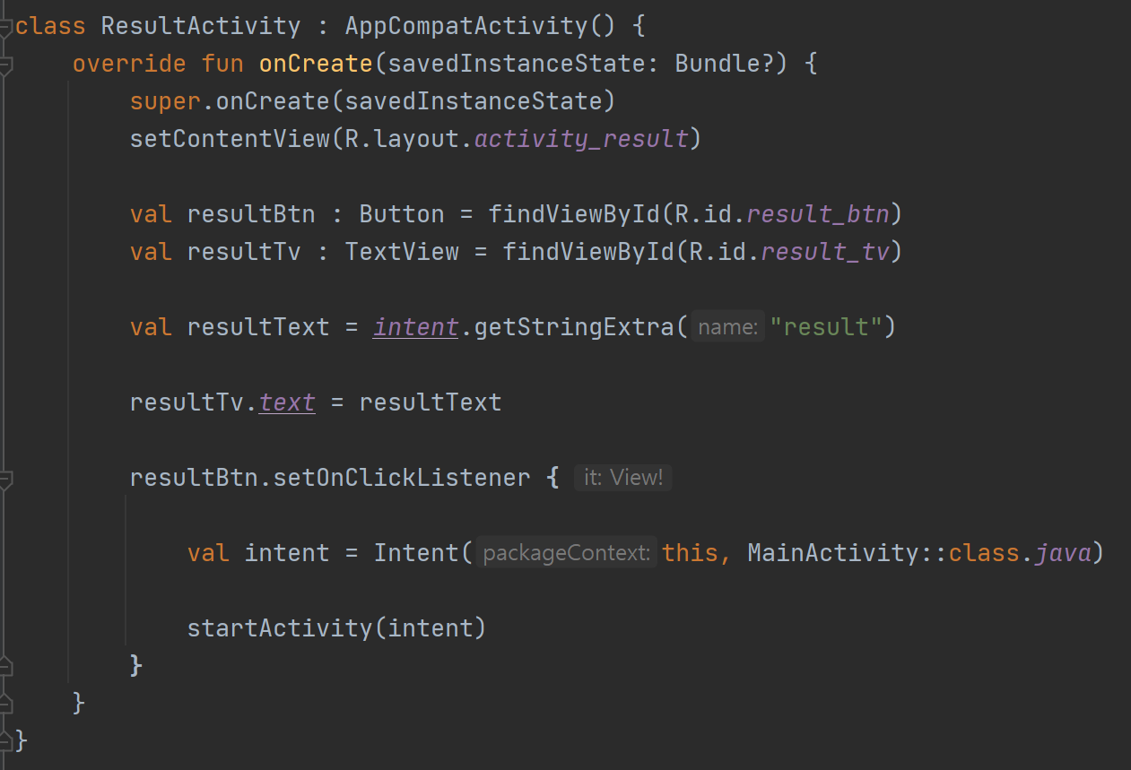 resultText라는 상수에 메인 액티비티에서 받은 텍스트 값을 넣어줍니다