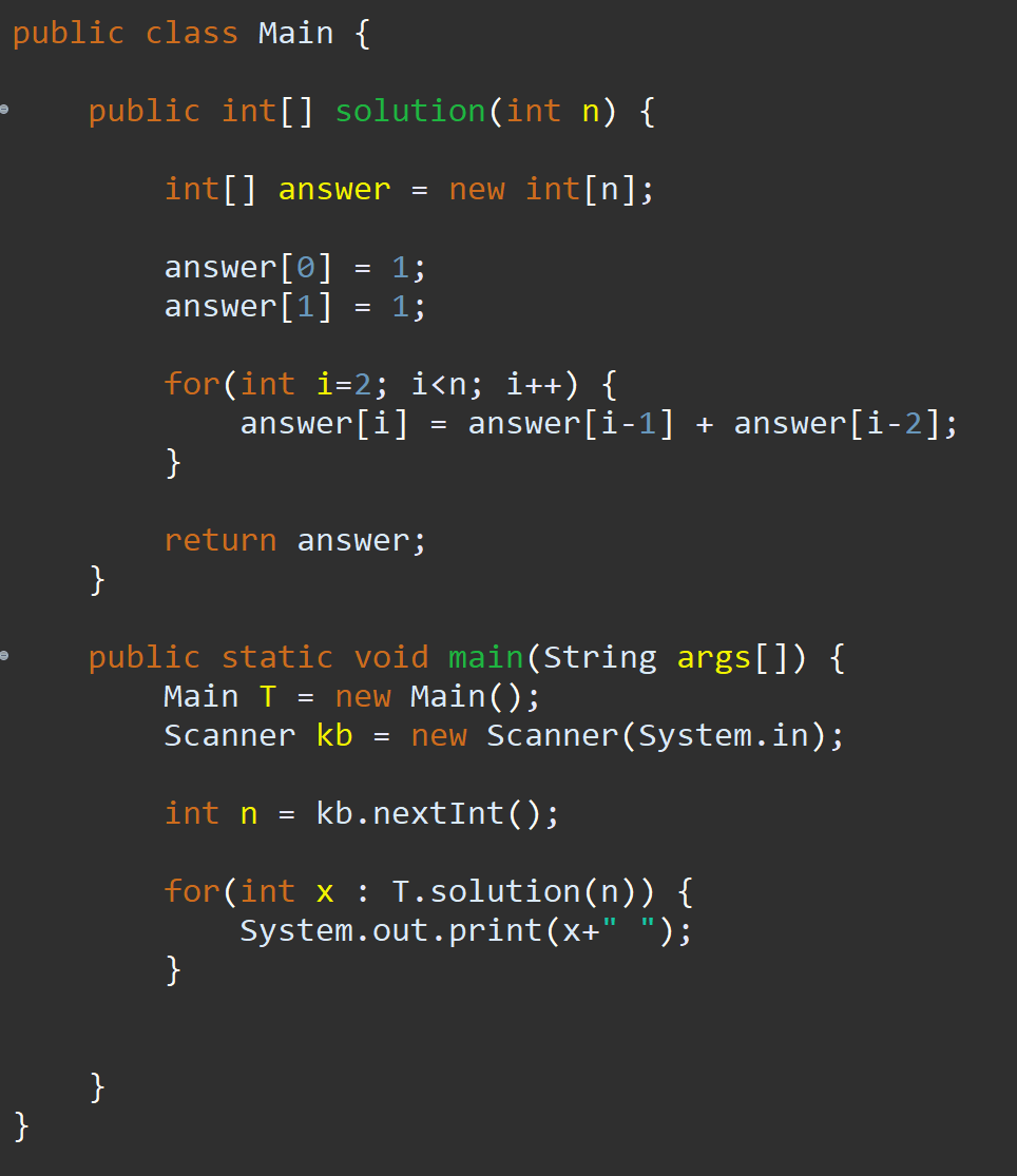 피보나치 수열에 첫번째와 두번째 값은 항상 1, 1이기 때문에 0번째와 1번째 인덱스에는 1을 넣어줬습니다.