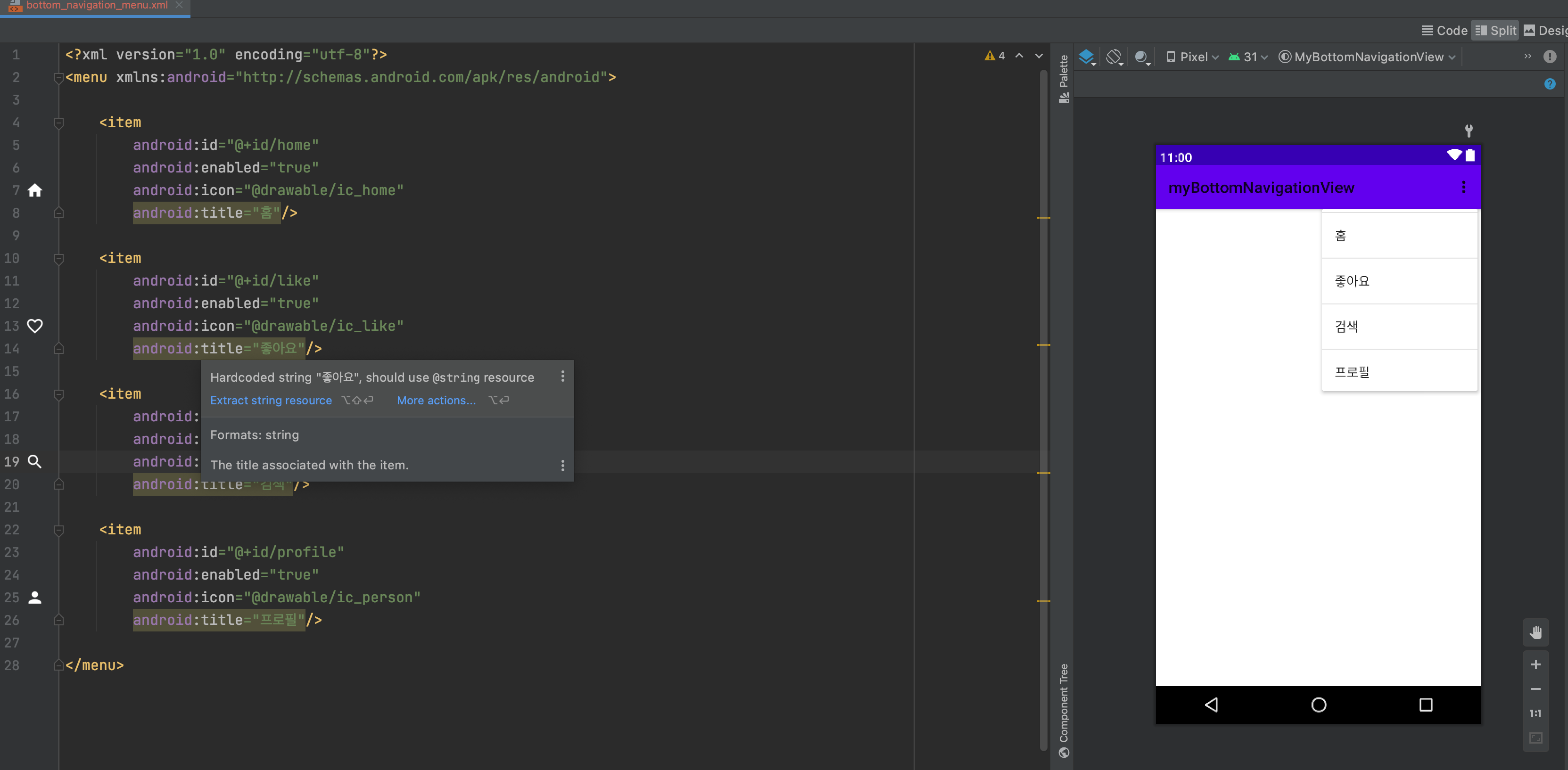 메뉴 리소스 파일을 만들었으면 안에 어떤 메뉴를 넣을건지 작성해줍니다.