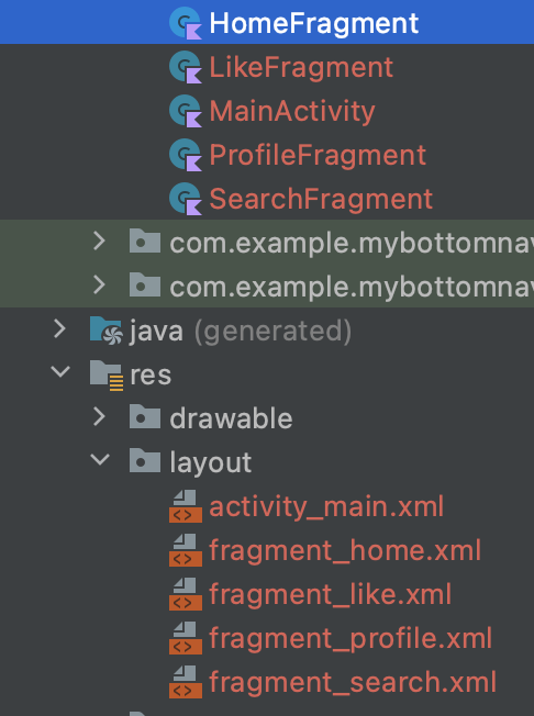 메뉴에서 추가 한 만큼 프래그먼트를 생성 해 주세요