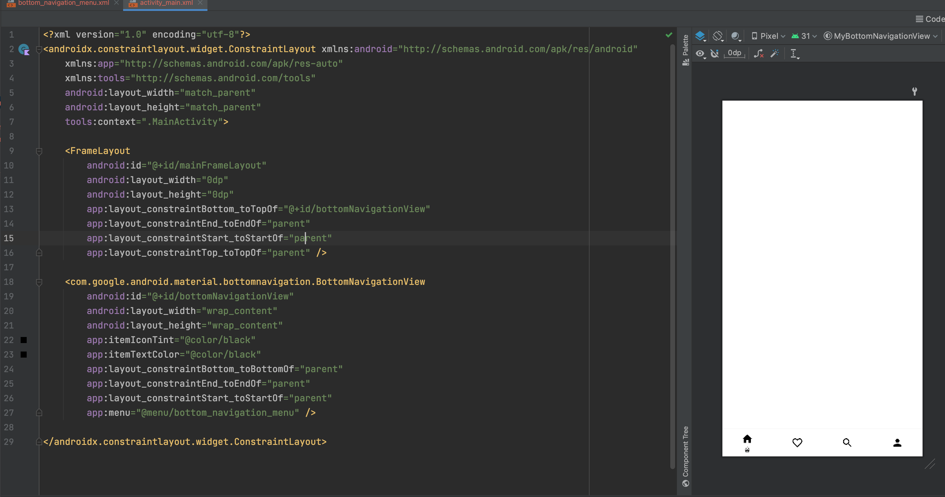 그리고 메인 액티비티 레이아웃으로 와서 바텀 네비게이션 뷰를 넣어줍니다.