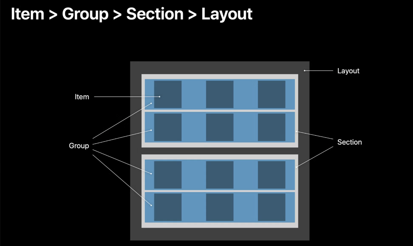 하지만 CompositionalLayout은 Item, Group, Section으로 구성되며 더 유연하게 복잡한 UI를 구성할 수 있습니다.